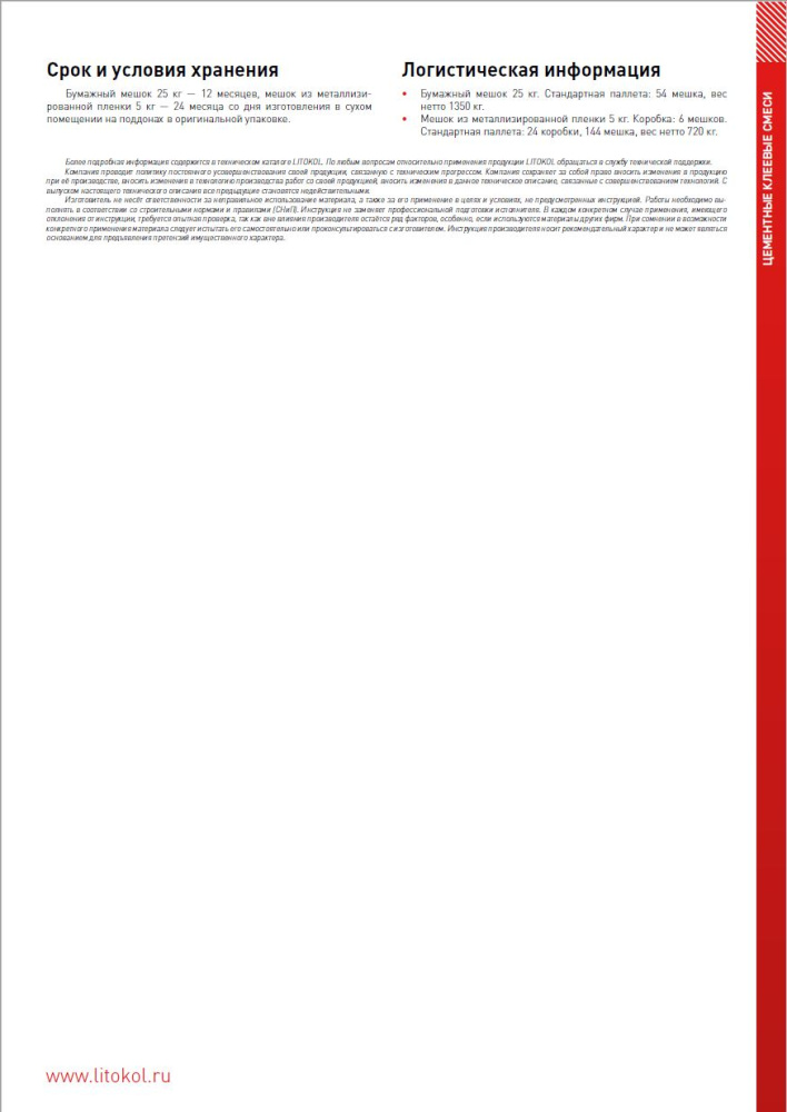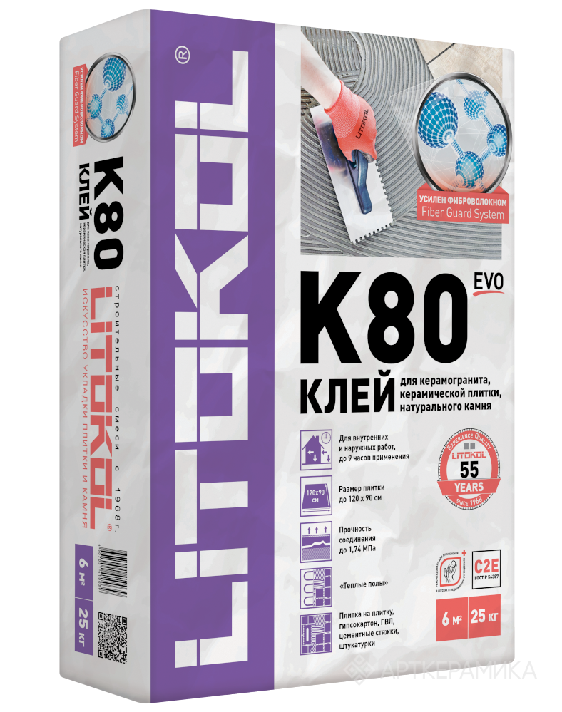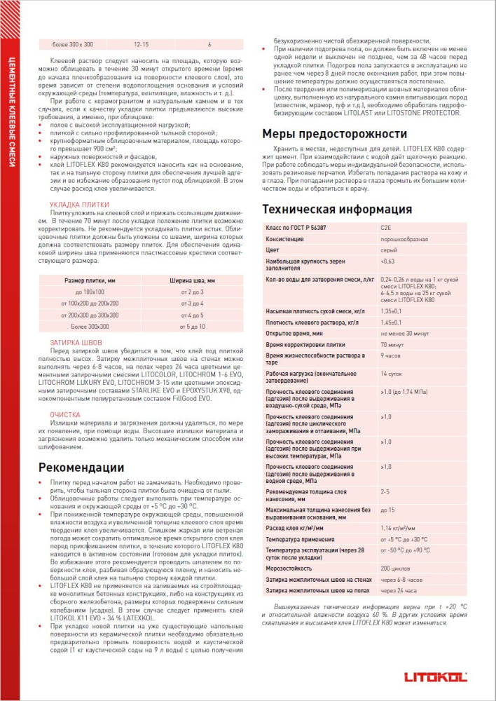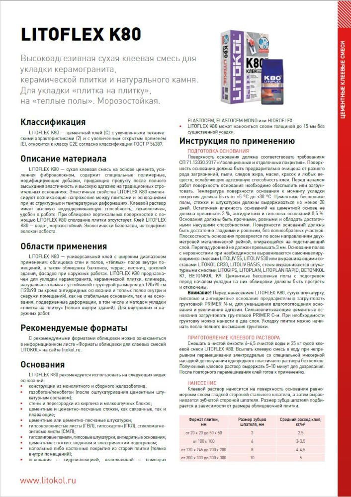 LITOFLEX K80 — цементный клей класса C2Е по EN 12004 и ГОСТ Р 56387 с улучшенными техническими характеристиками и увеличенным открытым временем. Он разработан для надежной укладки облицовочных материалов и сочетает удобство нанесения с высокой прочностью сцепления. Благодаря своей универсальности клей подходит для решения широкого спектра задач в строительстве и отделке.