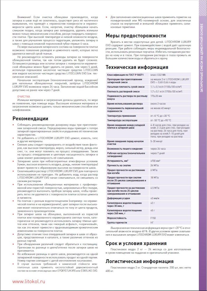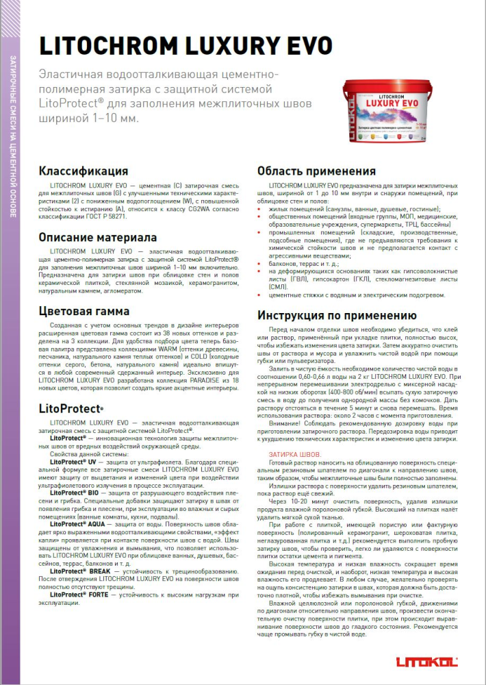 LITOCHROM LUXURY EVO — эластичная цементно-полимерная затирка с водоотталкивающими свойствами, предназначенная для заполнения межплиточных швов шириной от 1 до 10 мм. Она сочетает в себе высокую эстетичность и удобство в работе, обеспечивая однородный цвет и стойкость швов на протяжении всего срока эксплуатации. Минимальное содержание летучих органических соединений делает затирку безопасной для здоровья исполнителей, а упаковка из переработанных материалов поддерживает экологичность продукта.
